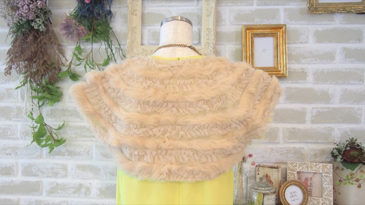 ファーを使用した定番カラーのベージュカラーボレロ。チュール生地をベースに、チュールのフリルとラビットファーを交互にミックスした華やかで甘く可愛らしいデザインです。ファーで季節感と重厚感は取り入れつつ、チュールのおかげで軽さが出て重たくなりすぎる心配もありません。また、暖房の効いた会場内でも蒸れずに着用いただけますよ。肩の切り替えがなく、肩幅が気になる方にもおすすめ。短めの袖丈と全体的にスッキリとコンパクトなシルエットで、幅広いドレスに合わせやすく取り入れやすいアイテムです。冬のパーティーや成人式の同窓会でファーを取り入れたいけどゴージャス感は抑えてコーディネートしたい方に。