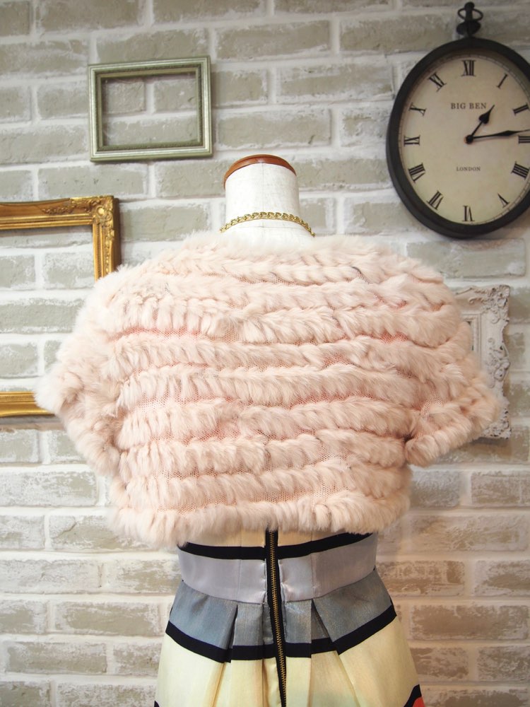 淡いピンクのシンプルなラビットファーボレロ。上品で優しいカラーは、明るい色味のドレスにも深い色味のドレスにも季節感と可愛らしくフェミニンな印象をプラスしてくれ、冬場のコーディネートを華やかに盛り上げてくれます。デザイン自体はシンプルなのでどんなスタイルにも取り入れやすく、可愛らしいドレスや大人っぽいドレス、ボリュームのあるドレスにもタイトなドレスにも組み合わせていただけますよ。パーティーや謝恩会や成人式等、華やかなドレスアップスタイルのお供にいかがですか?