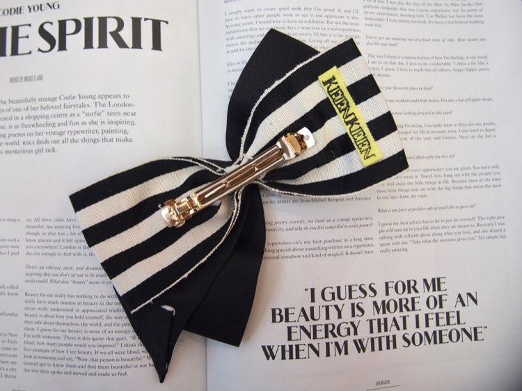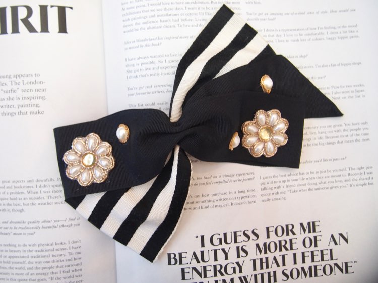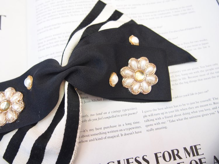 ハンドメイドのヘッドピース。インドやヨーロッパなど海外から輸入したパッチやヴィンテージリボンを使用しており、ドレス×ヘッドピースメインのコーディネートが楽しめる既製品にはないエッジの効いた色合いやデザインが特徴です。コーディネートにピリっとアクセントを与え、写真映えもバツグンで撮影にもぴったりです。こちらは、ヴィンテージのフレンチストライプリボンとパール感のあるビーズアップリケを組み合わせたバレッタ。モノトーンのドレスやビビッドカラーのドレスに合わせたコーディネートや鮮やかな柄物ドレスに合わせた柄×柄のコーディネートなど、ドレスとバレッタのカラーを引き立てあうような思い切った合わせ方で楽しんでいただきたいアイテム。お色直しや2次会、謝恩会や女子会だけでなく前撮りにもおすすめです。