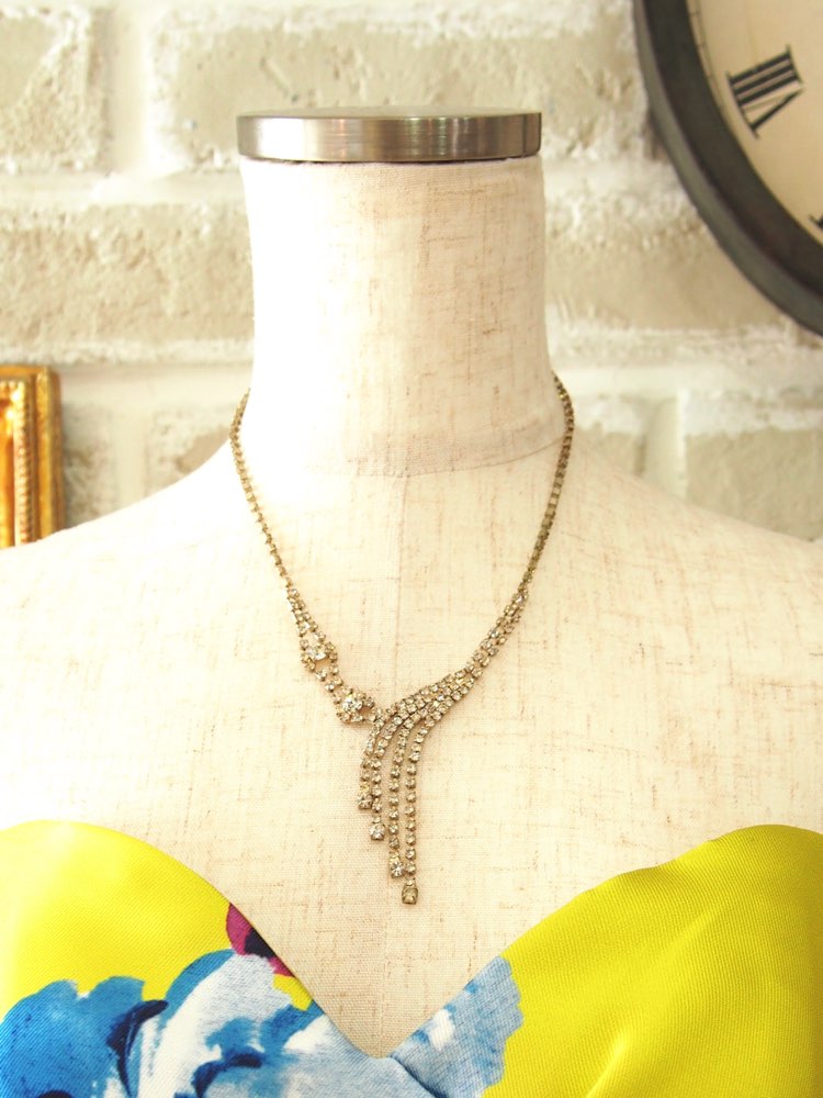 緩やかに流れ落ちるようなデザインがとてもエレガントイメージのショートネックレスです。全体に小さなラインストーンが埋め込まれており、細部まで華やかさにこだわっています。Vネックやベアトップなど、胸元が開くデザインのドレスと相性が良く、ちょっとしたパーティーやお食事からイブニングパーティーなどナイトシーンでのドレスアップスタイルまで、幅広いシーンに使いやすい大きさです。華奢な雰囲気で、デコルテ~首周り顔周りをスッキリかつ華やかに魅せてくれます。上品でやりすぎ感がなく、エレガントにもクールにも仕上げることができますよ。シャワー状に垂れ下がったデザインを活かすには、長さのないイヤーアクセと合わせるのがおすすめです。