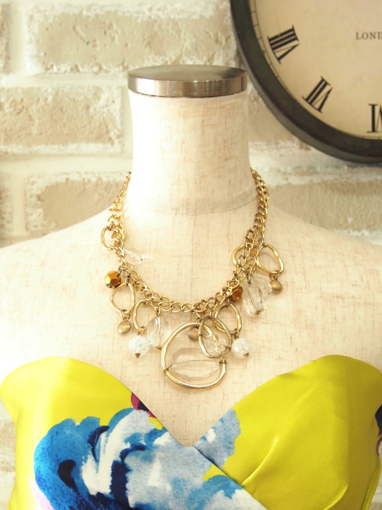 大振りのチャームやビーズを贅沢に組み合わせた、インパクト大のネックレスです。ゴールドのチェーンで肌馴染みが良く、ボリューミー。普段使いよりもワンランク大きめのネックレスで、ガーデンパーティーなどの、頑張りすぎず少しこなれ感を狙ったスタイルに飾りのないシンプルなドレスのアクセントとしてコーディネートするのがおすすめです。また、大振りのパーツのアクセサリーは写真映えもバッチリ。取り入れるだけで華やかさを残した大人カジュアルな雰囲気を纏うことができるネックレスです。首の詰まったドレスの胸元に重ねるとバランス◎。