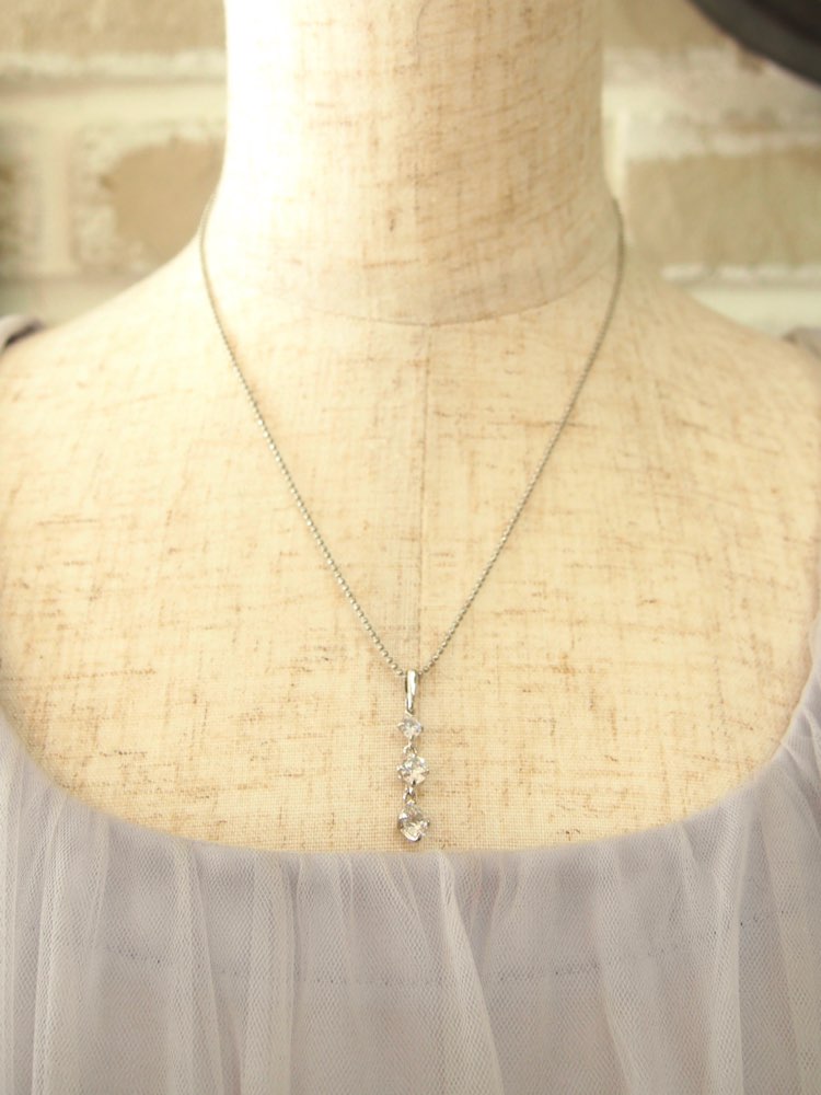 小さなストーンを3つ繋げたシンプルなペンダント。結婚式のお呼ばれなどにはパールのイヤリング等と組み合わせて、ちょっとしたお食事やパーティーでは清潔感あるコーディネートに。また、華やかなドレスやヘッドアクセや大振りのイヤーアクセに引き算で組み合わせた、パーティーのドレスアップスタイルにも。華奢で上品に見え、マルチに使えるシンプルなデザインです。小粒でも程よくキラッとするので、デコルテを綺麗に魅せたい場合や派手にするよりこなれ感重視の場合にももってこいです。首の短さや顔の大きさが気になるといったお悩みをお持ちの方にもすっきりと着けていただけます。