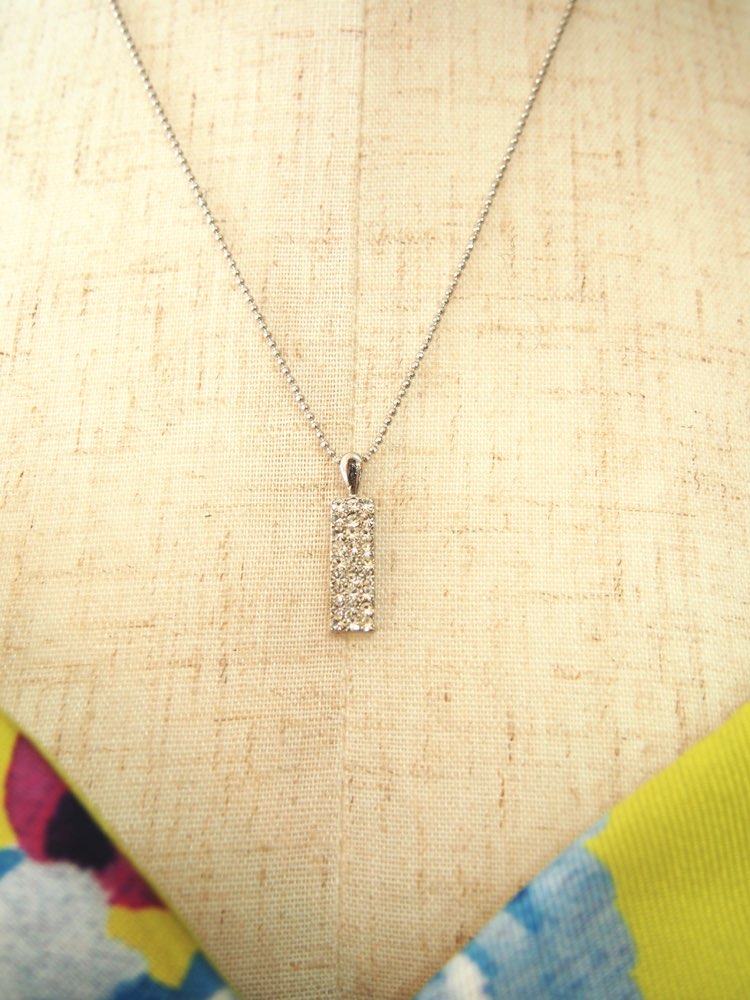 小さなストーンを埋め込んだプレートのシンプルなペンダント。結婚式のお呼ばれなどにはパールのイヤリング等と組み合わせて、ちょっとしたお食事やパーティーでは清潔感あるコーディネートに。また、華やかなドレスやヘッドアクセや大振りのイヤーアクセに引き算で組み合わせた、パーティーのドレスアップスタイルにも。シャープで大人っぽく見えるシルバーで、マルチに使えるシンプルなデザインです。小粒でも程よくキラッとするので、デコルテを綺麗に魅せたい場合や派手にするよりこなれ感重視の場合にももってこいです。首の短さや顔の大きさが気になるといったお悩みをお持ちの方にもすっきりと着けていただけます。