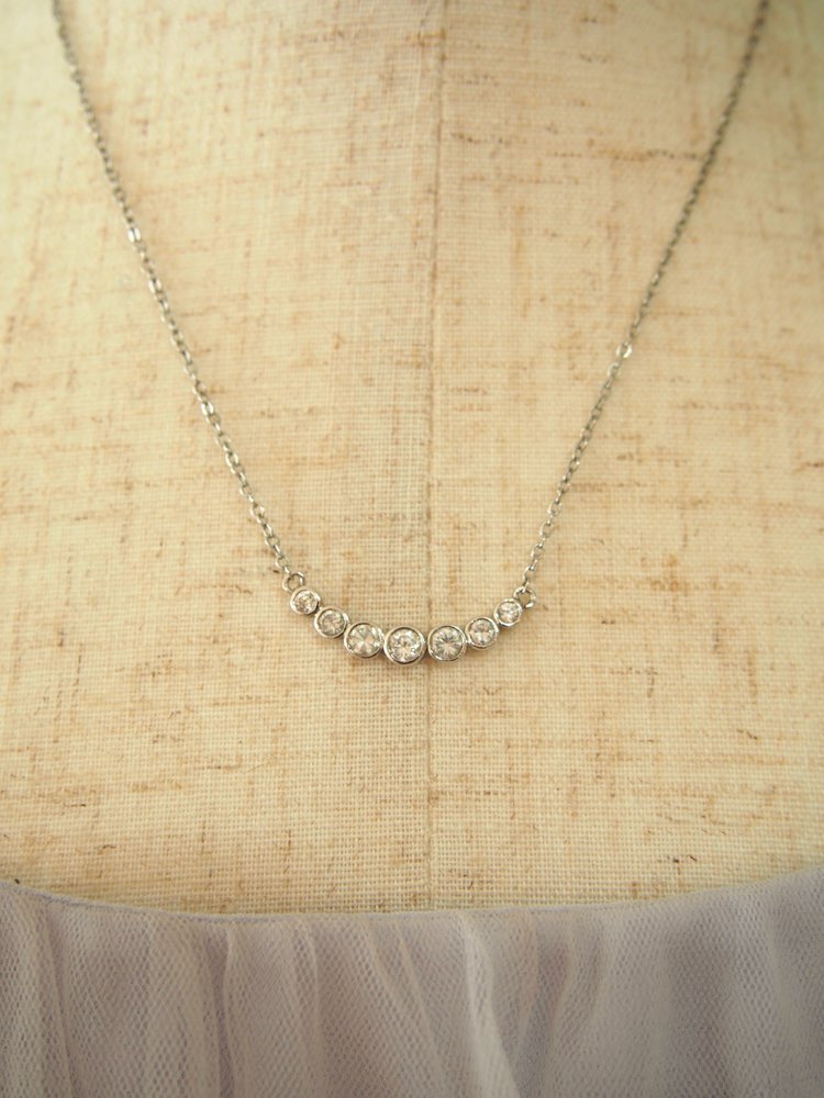 小さなストーンを3つ繋げたアーチのシンプルなペンダント。結婚式のお呼ばれなどにはパールのイヤリング等と組み合わせて、ちょっとしたお食事やパーティーでは清潔感あるコーディネートに。また、華やかなドレスやヘッドアクセや大振りのイヤーアクセに引き算で組み合わせた、パーティーのドレスアップスタイルにも。華奢で上品に見えるデザインで、マルチに使えるシンプルなデザインです。小粒でも程よくキラッとするので、デコルテを綺麗に魅せたい場合や派手にするよりこなれ感重視の場合にももってこいです。首の短さや顔の大きさが気になるといったお悩みをお持ちの方にもすっきりと着けていただけます。
