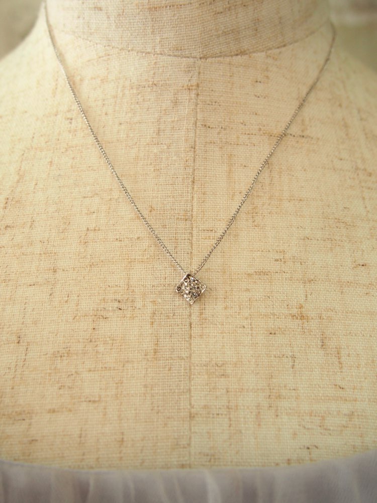 小さな正方形のストーンをぶら下げたシンプルなペンダント。結婚式のお呼ばれなどにはパールのイヤリング等と組み合わせて、ちょっとしたお食事やパーティーでは清潔感あるコーディネートに。また、華やかなドレスやヘッドアクセや大振りのイヤーアクセに引き算で組み合わせた、パーティーのドレスアップスタイルにも。華奢で上品に見え、マルチに使えるシンプルなデザインです。小粒でも程よくキラッとするので、デコルテを綺麗に魅せたい場合や派手にするよりこなれ感重視の場合にももってこいです。首の短さや顔の大きさが気になるといったお悩みをお持ちの方にもすっきりと着けていただけます。