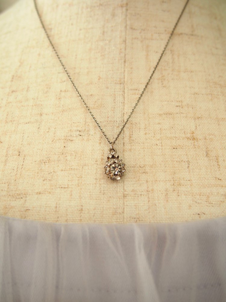 小さなロゼッタモチーフのシンプルなペンダント。アンティークゴールドのチェーンで肌馴染みもバッチリ。結婚式のお呼ばれなどにはパールのイヤリング等と組み合わせて、食事会・顔合わせでの清潔感あるコーディネートに。また、華やかなドレスやヘッドアクセや大振りのイヤーアクセに引き算で組み合わせた、パーティーや新婦様のドレスアップスタイルにも。マルチに使えるクラシックなデザインです。小粒でも程よくキラッとするので、デコルテを綺麗に魅せたい場合や派手にするよりこなれ感重視の場合にももってこいです。首の短さや顔の大きさが気になるといったお悩みをお持ちの方にもすっきりと着けていただけます。