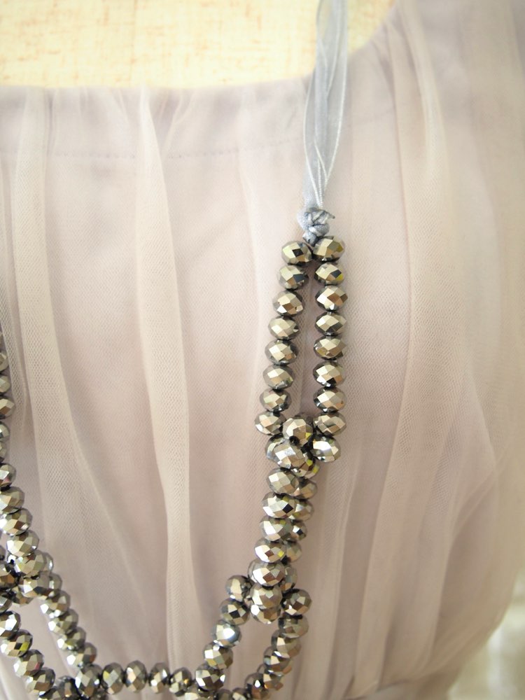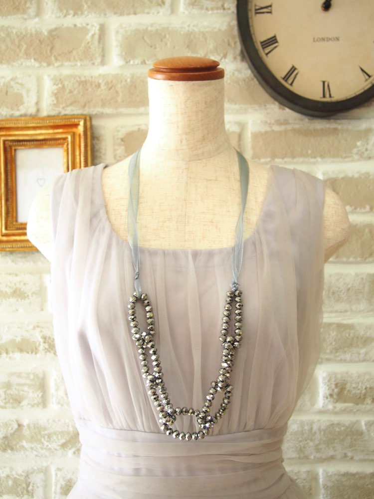 ネイビーのミラービーズが鎖状にデザインされた、ロングタイプのネックレス。ちょっとしたパーティーやお食事などでの軽いドレスアップスタイルにおすすめです。カラーとデザイン全体が落ち着いた印象で、ナチュラルシックなコーディネートにしたい場合に。飾りのないシンプルなストレートタイプのドレスと相性が良く、普段のワンピースなどのお洋服との組み合わせもOKです。長さのないイヤーアクセと合わせると、首の短さや顔の大きさが気になるといったお悩みをお持ちの方にもすっきりと着けていただけます。ビーズの質感のおかげで重たく見えることもなく、程よく華やかさがプラスされます。金属アレルギーの方にも。