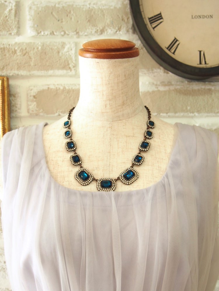 アンティークな色合いと大きめのビジューがゴージャスな雰囲気のネックレス。演奏会やディナーショーなど華やかからカジュアルまで、パーティースタイルのコーディネートのアクセントとして取り入れることができます。ブラックやシルバーのシックで大人なドレスに合わせても、反対色や淡い色のドレスに挿し色や締め色として取り入れてもOK。丸みのあるネックラインのドレスと相性◎です。王道のパーティージュエリーとは少し差をつけたい方におすすめです。ドレスから他の小物までアンティーク感をテーマにコーディネートするのも面白かもしれませんね。