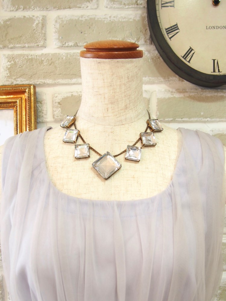 ボリュームのあるアクリルビジューがコーディネートの主役になること間違いなしのネックレス。ダークカラーやビビッドカラーの濃い色のシンプルなドレスにアクセントやハズしとして取り入れるとパワフルでかっこいいスタイルに。思い切ってイヤーアクセは小さめで、作り込みすぎないヘアスタイルで引き算をしてこなれ感を狙うとおしゃれに仕上がります。クリスマスなどのイベントやナイトシーンのパーティーなど、大人なドレスアップを試したい場合にチャレンジしてみてください。レンタルだからこそ挑戦できるインパクト大のデザインです。