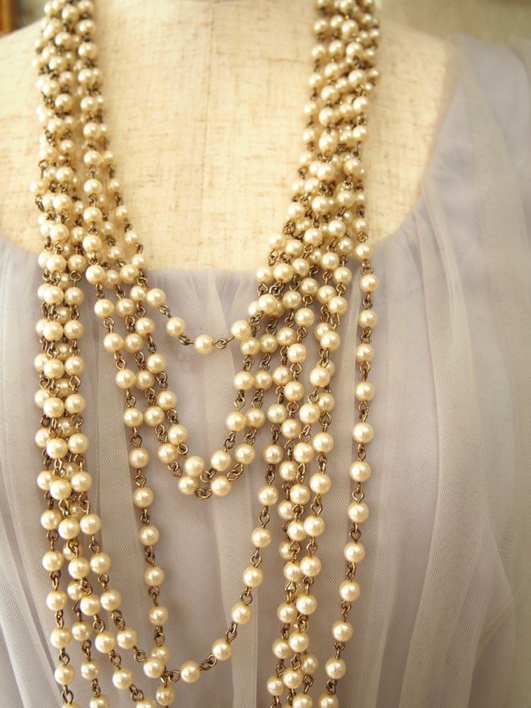 女性らしい雰囲気をプラスしてくれるロングタイプのネックレス。クリームカラーのパールをたっぷり使ったボリュームのあるデザインです。ロングタイプなので顔周りをすっきりと見せてくれ、華やかさをプラスします。飾りのないシンプルなドレスにONすれば特別感あるドレスアップスタイルに様変わり。ゴールドの金具に黄みのあるパールは肌馴染みも良く、結婚式などのお呼ばれドレスにはもちろん、小ぶりのパールなのでパーティーや同窓会などにも着けやすい印象です。派手すぎるのは避けたいけれど、ワンポイント華やかさが欲しいといった場合にぜひ取り入れてみてください。