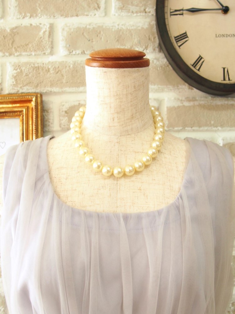 少し大きめサイズのパールを使用したショートネックレス。クリームカラーで肌馴染みが良く、きちんとしたいフォーマルなシーンからカジュアルまで、シンプルで万能なタイプです。カジュアルに取り入れたい場合も、どんなドレスにも間違いなく合わせることができます。特に、可愛らしくドーリーな雰囲気にもとても相性がよく、バービーのようなスタイルに。長さは短めで、バランスが全体の上の方に来るのでスタイルアップにつながります。パールのアクセサリーはレフ板効果もあり、顔色も明るく見せてくれるのも嬉しいポイントですね。