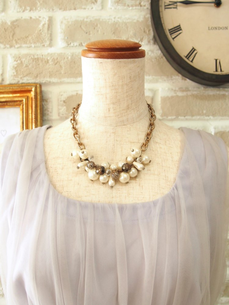 ナチュラルな色味のチャームやパールをビーズゴロゴロっと組み合わせたネックレスです。優しい雰囲気のアンティークゴールドのチェーンにパールで肌馴染みが良く、ボリューミー。普段使いよりも少しだけ大きめのネックレスで、同窓会やちょっとしたパーティーなどの、頑張りすぎないドレスアップスタイルに飾りのないシンプルなドレスのアクセントとしてコーディネートするのがおすすめです。また、大振りのパーツのアクセサリーは写真映えもバッチリ。取り入れるだけでフェミニンで程よい華やかさを纏うことができるネックレスです。首の詰まったドレスの胸元に重ねるとバランス◎。