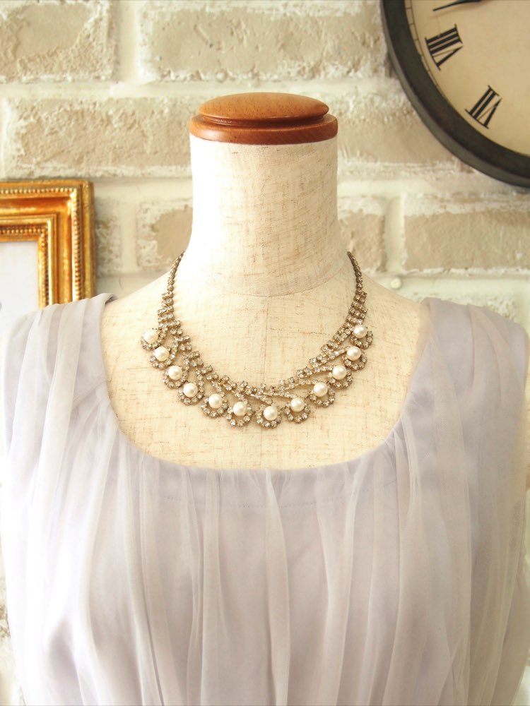 全体に埋め込まれたシルバーのラインストーンの輝きがゴージャスなネックレス。パールの上品な雰囲気も相まって、ゴージャスでエレガントな印象です。パーティーの席でも胸元を華やかに彩り、写真映りもバッチリ。アジャスターが調節可能なので、ドレスとバランスを合わせてチョーカー風としても、ショートタイプとしても着用することができます。シルバーカラーなので、どんなドレスにも合うパーティージュエリーの王道ですね。胸元が開くデザインのドレスと相性が良く、イブニングパーティーや演奏会・ディナーショーなど華やかに着飾るシーンにおすすめです。