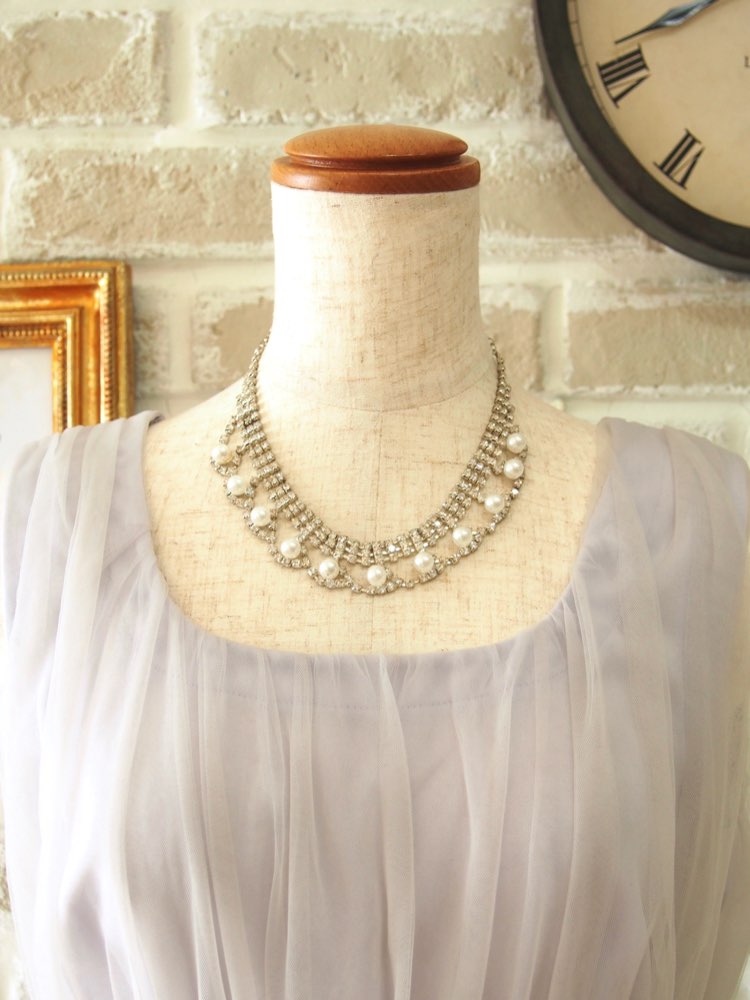 全体に埋め込まれたシルバーのラインストーンの輝きがゴージャスなネックレス。パールの上品な雰囲気も相まって、ゴージャスでエレガントな印象です。パーティーの席でも胸元を華やかに彩り、写真映りもバッチリ。アジャスターが調節可能なので、ドレスとバランスを合わせてチョーカー風としても、ショートタイプとしても着用することができます。シルバーカラーなので、どんなドレスにも合うパーティージュエリーの王道ですね。胸元が開くデザインのドレスと相性が良く、イブニングパーティーや演奏会・ディナーショーなど華やかに着飾るシーンにおすすめです。