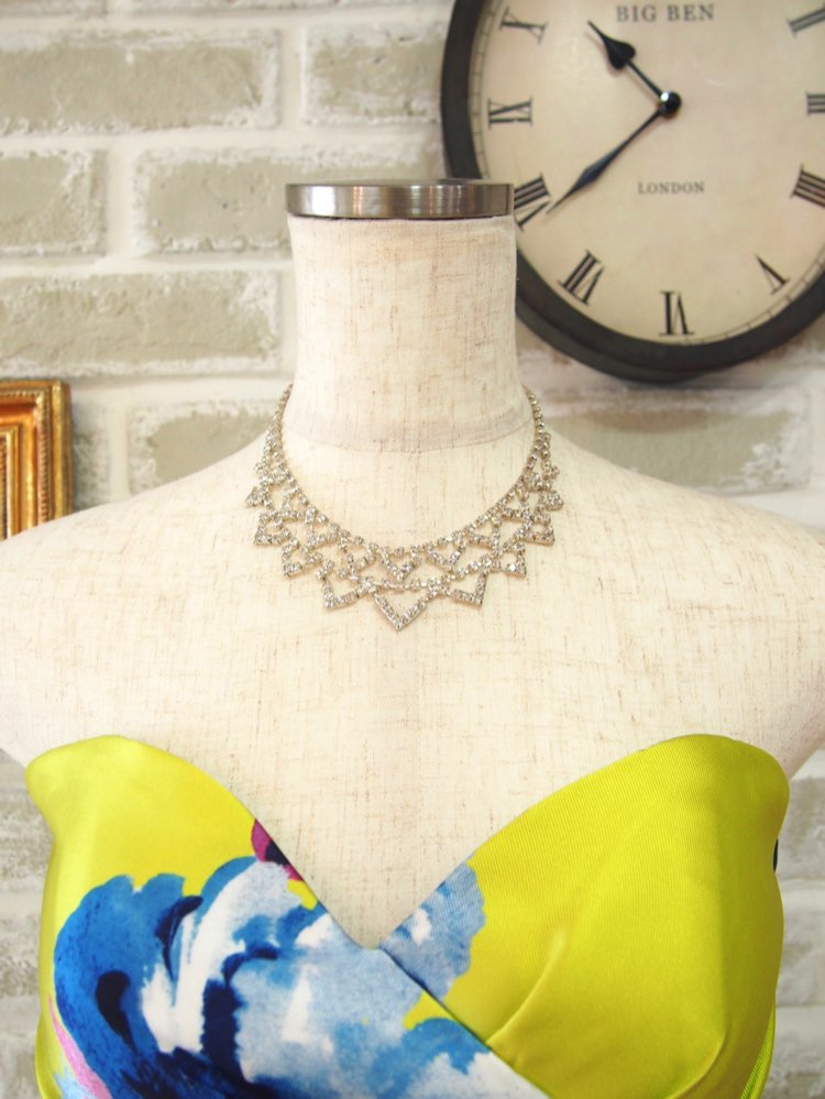 シルバーのギザギザデザインラインストーンが、かっこいいイメージのショートネックレスです。全体に小さなラインストーンが埋め込まれており、キラキラと華やかです。Vネックやベアトップのドレスと相性が良く、煌びやかなパーティーでのドレスアップや新婦様の披露宴でのアクセサリーにもってこいです。角のあるデザインは、クールでシャープなイメージに仕上がるので、エッジが効いたかっこいい・大人っぽいコーディネートを目指す方にぴったり。幅のあるデザインを活かすには、長さのないイヤーアクセやすっきりまとめたヘアスタイルがおすすめです。イヤーアクセも角のあるデザインやシンプルなものが相性◎です。