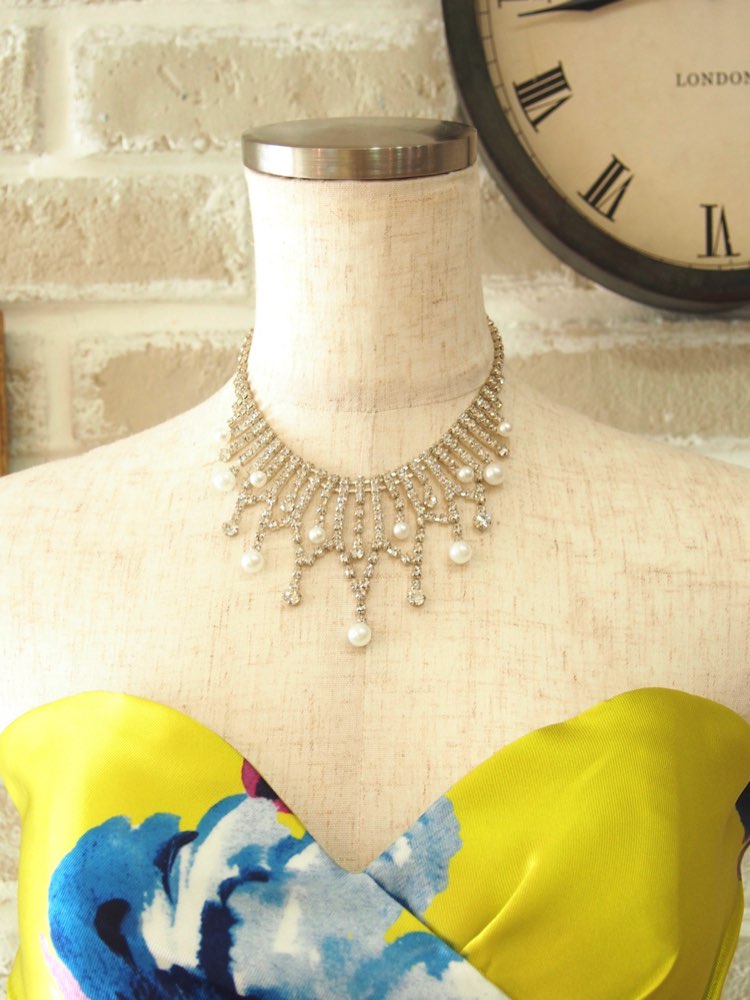 インパクトあるシャンデリアのようなシャワー状のシルバーラインストーンにパールを散りばめたネックレス。ゴージャスでエレガント、大人の雰囲気漂うアイテムです。まさに主役級ネックレスで、デコルテを彩るボリューミーなデザインがとっても華やか。ネックレスの存在感を楽しめる胸元のあいたドレスや、ブラックドレスに合わせれば、華やかさはもちろんドレスをより引き立ててくれる効果も◎。花嫁様用のウエディングドレスやカクテルドレスに合わせるネックレスとしてももちろんご利用いただけ、イブニングパーティーを始め演奏会や船上パーティなど普段よりも数段上のドレスアップで臨みたいシーンでぜひご利用ください。