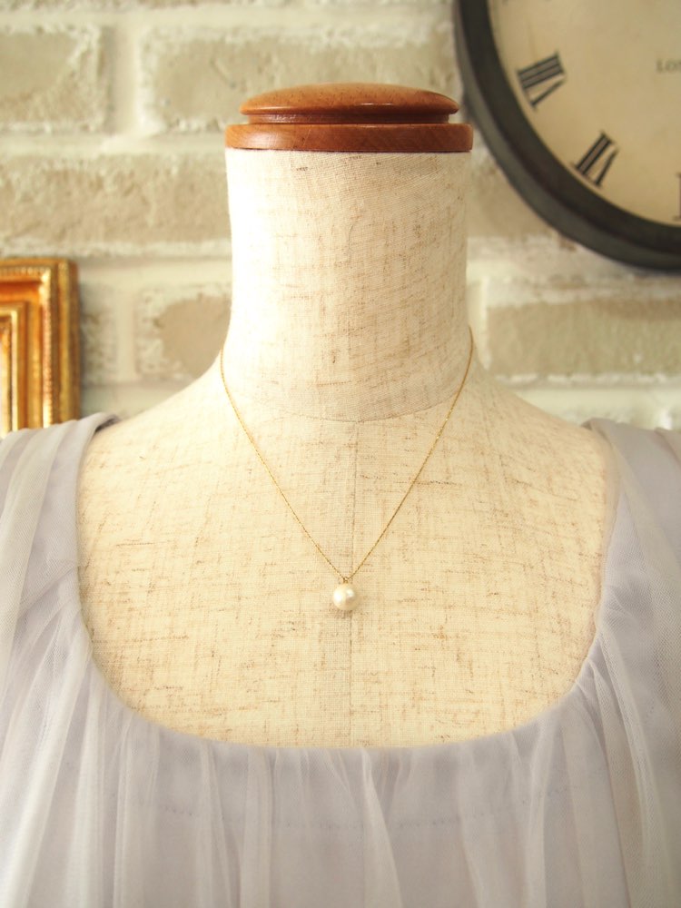 コットンパールのシンプルなペンダント。ナチュラルなカラーのパールとゴールドのチェーンで肌馴染みもバッチリ。結婚式のお呼ばれなどにはパールのイヤリング等と組み合わせて、食事会・顔合わせでの清潔感あるコーディネートにも。また、華やかなドレスやヘッドアクセや大振りのイヤーアクセに引き算で組み合わせた、パーティーや新婦様のドレスアップスタイルにも。マルチに使えるクラシックなデザインです。小粒のパールでもレフ板効果で肌をふわっと明るく見せてくれ、顔まわりをすっきり見せたい場合や派手にするよりこなれ感重視の場合にももってこいです。軽いつけ心地で、ネックレス初心者の方にもおすすめです。