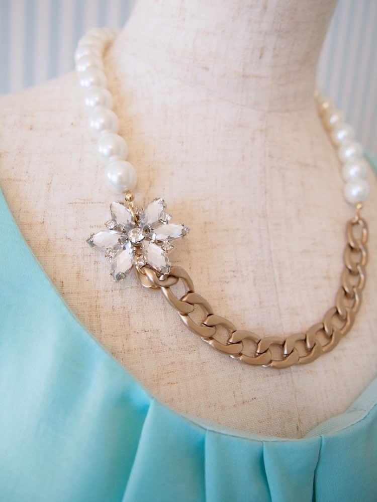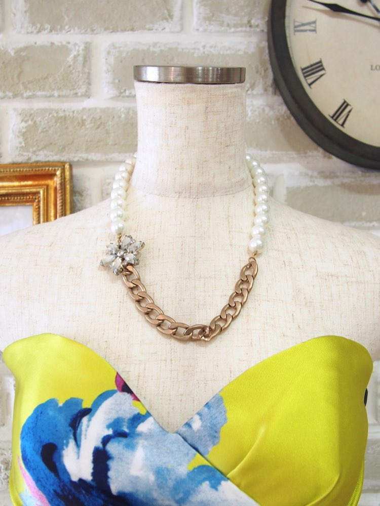 サイドのビジューがアクセントになりエレガントな印象のパールとチェーンのコンビネックレス。存在感のあるフラワーモチーフのビジューの煌びやかさとパールのレフ板効果が、顔周りを華やかに彩ってくれます。シンプルなドレスもパッと明るくなる1本です。AラインやIラインのドレスはもちろん、パンツドレスにもバランスよく合わせていただけます。チェーンはマットな質感なのでハードな雰囲気が抑えられており、結婚式2次会やちょっとしたパーティーなど、普段のお洒落よりももう少し華やかさが欲しいシーンのお出かけにおすすめです。