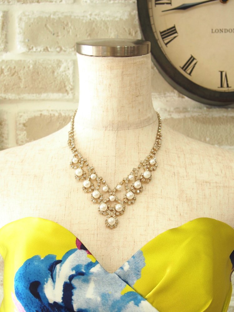 インパクトあるV字のシルバーラインストーンにパールを散りばめたネックレス。ゴージャスでエレガント、大人の雰囲気漂うアイテムです。まさに主役級ネックレスで、デコルテを彩るボリューミーなデザインがとっても華やか。ネックレスの存在感を楽しめる胸元のあいたドレスや、ブラックドレスに合わせれば、華やかさはもちろんドレスをより引き立ててくれる効果も◎。花嫁様用のウエディングドレスやカクテルドレスに合わせるネックレスとしてももちろんご利用いただけ、イブニングパーティーを始め演奏会や船上パーティなどドレスアップ機会にぜひご利用ください。