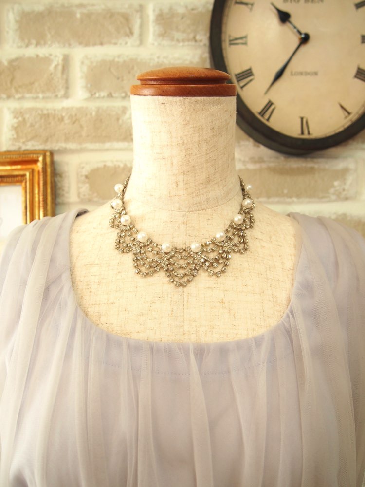 シルバーのラインストーンがレースのようなデザインのネックレス。パールの優しさも相まって、フェミニンでエレガントな印象です。パーティーの席でも顔周りを華やかに彩り、写真映りもバッチリ。アジャスターが調節可能なので、ドレスとバランスを合わせてチョーカー風としても、ショートタイプとしても着用することができます。シルバーカラーなので、どんなドレスにも合うパーティージュエリーの王道です。謝恩会やパーティーはもちろん、新婦様のアクセサリーとしてもおすすめ。プリンセスシルエットからマーメイドまであらゆるタイプのウエディングドレスやカクテルドレスに合わせることができます。丸みのあるデザインは、女性らしい雰囲気に魅せてくれます。