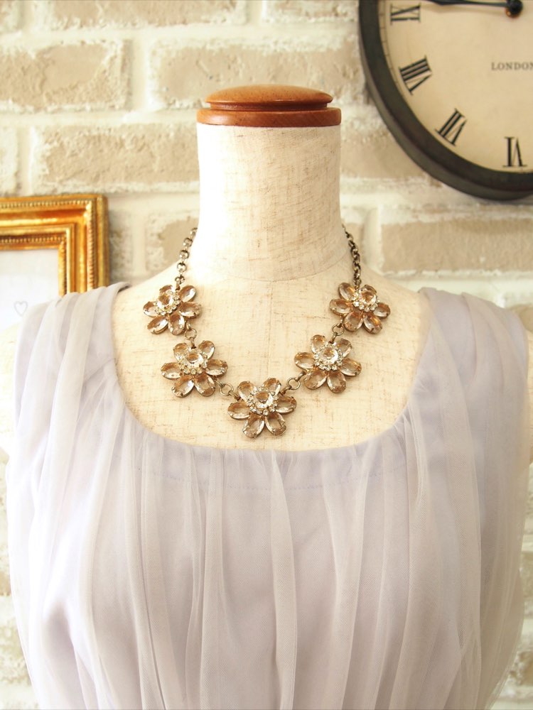 クリアカラーのアクリルストーンを埋め込んだ、フラワーモチーフネックレスです。ゴールドカラーのベースで肌馴染みが良く、ボリューミーでもナチュラルで取り入れやすさがあります。普段使いよりもワンランク大きめのネックレスで、パーティーや同窓会、謝恩会などの普段よりも華やかでおしゃれなスタイルに。お呼ばれ等その他のシーンでは、パールの一粒イヤリングなどと合わせて、飾りのないシンプルなドレスのアクセントとしてコーディネートするのもおすすめです。軽さのある雰囲気で、10~20代の若い年代の方にもやりすぎ感がなく着用いただけます。