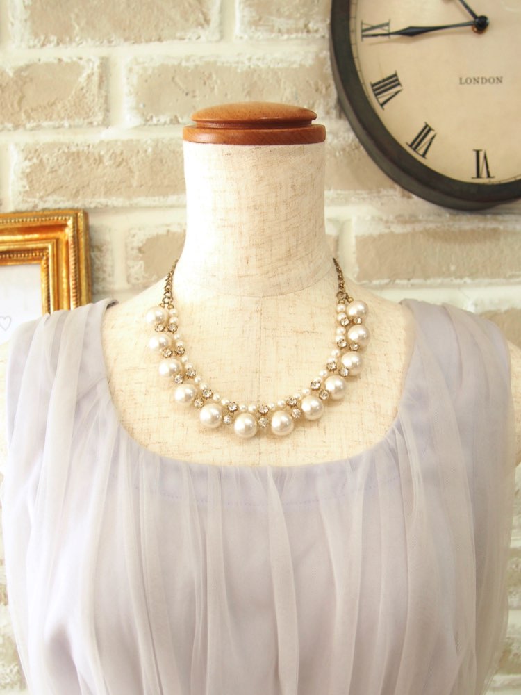連なるパールと間のストーンが優しく光を放ち、上品な女性を演出してくれるネックレス。大小様々なパールを、レースのように編み込んだデザインが華やかな印象に仕上げてくれます。パーティーからフォーマルシーンまで大活躍してくネックレスは、どんなドレスにもよく合い、程よい華やかさ・程よいボリューム感でちょうど良いと当店でも人気のアイテムです。単品使いはもちろん、ビジュー系・パール系のアクセサリーとセット使いすることで、より華やかなオシャレをお楽しみいただけます。パールのアクセサリーはレフ板効果もあり、顔色も明るく見せてくれるのも嬉しいポイントですね。