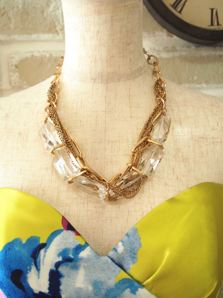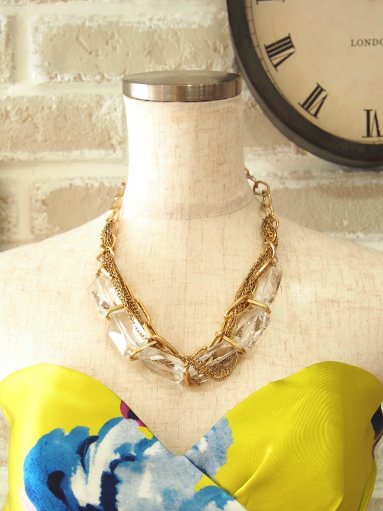 クリアカラーのストーンと太さの違うチェーンをランダムにまとめたゴールドカラーのネックレス。パーティーやお食事会などでのちょっとしたドレスアップスタイルにおすすめです。特にナイトシーンのパーティーなど、大人なドレスアップを試したい場合にチャレンジしてみてください。飾りのないスレンダーやタイトなシルエットのドレスと相性が良く、普段のお洋服との組み合わせもOKです。首元の開きがあまりないドレスの上に重ねたり、胸元が大きく開くドレス、どちらにも相性◎。余計な装飾がない肌馴染みのいいゴールドは、長さのないイヤーアクセと合わせると、首の短さや顔の大きさが気になるといったお悩みをお持ちの方にもすっきりとかっこよく着けていただけます。