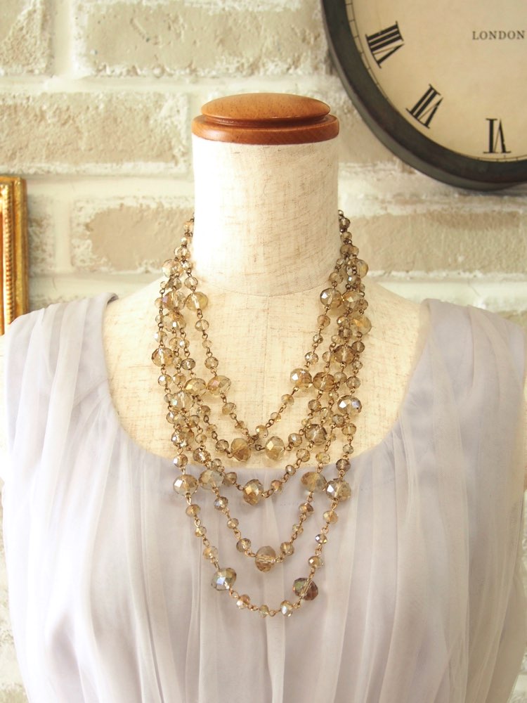 ベージュのミラービーズをランダムにつなげた、ミディアムタイプのネックレス。ちょっとしたパーティーやお食事などでの軽いドレスアップスタイルにおすすめです。キラキラ光るミラービーズの華やかさを持ちながら、クリアな質感のおかげで全体が柔らかな印象で、華やかだけどナチュラルさのあるコーディネートにしたい場合に。飾りのないシンプルなストレートタイプのドレスと相性が良く、普段のワンピースなどのお洋服との組み合わせもOKです。長さのないイヤーアクセと合わせると、首の短さや顔の大きさが気になるといったお悩みをお持ちの方にもすっきりと着けていただけます。ビーズの質感のおかげで重たく見えることもなく、程よく華やかさがプラスされます。