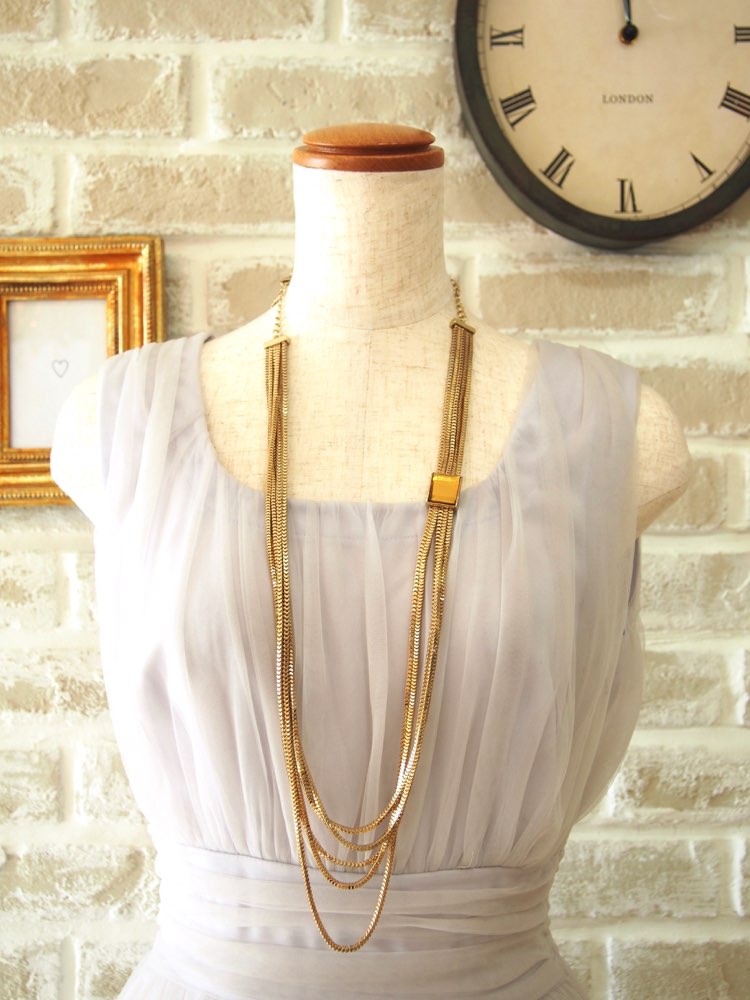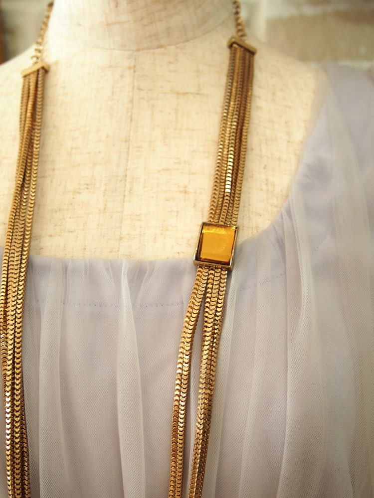ゴールドカラーのチェーンにブロンズカラーのビジューを組み合わせたロングタイプのネックレス。パーティーやちょっとした食事会などでのドレスアップスタイルにおすすめです。エレガントなデザインで、大人でスタイリッシュなコーディネートにしたい場合に。飾りのないスレンダーやタイトなシルエットのシフトドレスと相性が良く、程よいストーンの華やかさで、普段のお洋服との組み合わせもOKです。長さのないイヤーアクセと合わせると、首の短さや顔の大きさが気になるといったお悩みをお持ちの方にもすっきりとかっこよく着けていただけます。