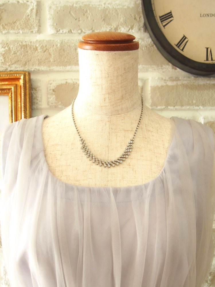 全体に小さなラインストーンが埋め込まれたたシンプルなチョーカーネックレス。結婚式のお呼ばれなどにはパールのイヤリング等と組み合わせて、顔合わせや食事会では清潔感あるコーディネートに。また、華やかなドレスやヘッドアクセや大振りのイヤーアクセに引き算で組み合わせて、新婦様のウエディングドレスやパーティーのドレスアップスタイルにも。華奢で上品に見えて、マルチに使えるシンプルなデザインです。あらゆるタイプのドレスとも相性が良く、ドレス自体のデザインを引き立ててくれます。