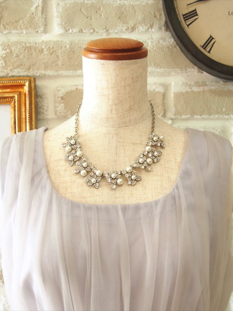 パールとラインストーンがゴージャスなフラワーデザインのネックレス。びっしりと詰まったボリューム感で、シンプルなドレスにバッチリ華やかさを添えることができます。可愛らしいイメージのお花のデザインとは一味違い、大人のフェミニンなスタイルにもクールなスタイルにもコーディネートの相性◎です。結婚式の参列や新婦様のアクセサリーとしてはもちろん、パーティーなどのドレスアップスタイルにもお使いいただけます。首回りにしっかりとボリュームが出るので、イヤーアクセはあまり長さのないもの、ヘアスタイルはまとめてあげるとスッキリとバランスよく着こなせます。華やかさ重視の方にぜひ。
