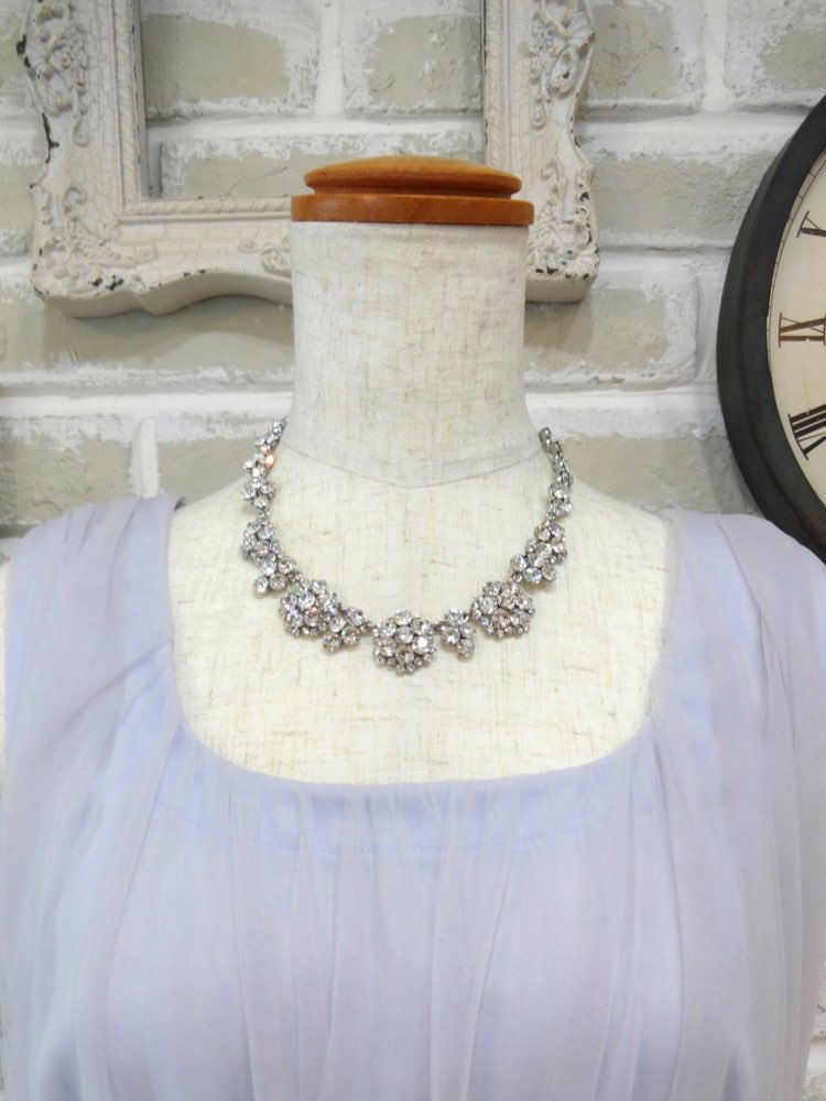 シルバーの小さな粒々ストーンをボール状に配した、ラグジュアリーなシルバービジューネックレスです。ストーンの配置や間に抜きを作り奥行きを出したデザインで、細部まで華やかさにこだわっており新婦様の女性らしさをさらに引き立てます。胸元が大きく開くネックラインのドレスと特に相性が良く、新婦様の挙式や披露宴、1.5次会までのウエディングドレスや、イブニングパーティーでの華やかなドレスなどに合わせて、煌びやかにドレスアップするシーンでお使いいただけます。流行りのナチュラルやヴィンテージな雰囲気のウエディングドレスと合わせると、今どきのファッショナブルなコーディネートに。首周りにボリュームが出るデザインなので、すっきりまとめたヘアスタイルがおすすめです。輝きが欲しい場合、ただ大きいものを選ぶより、このアイテムのように大きくなくても大粒のストーンが入ったものを選ぶのが◎です。