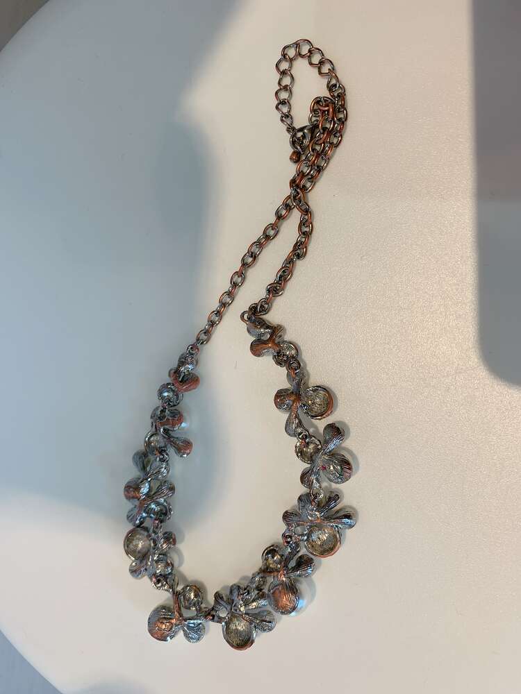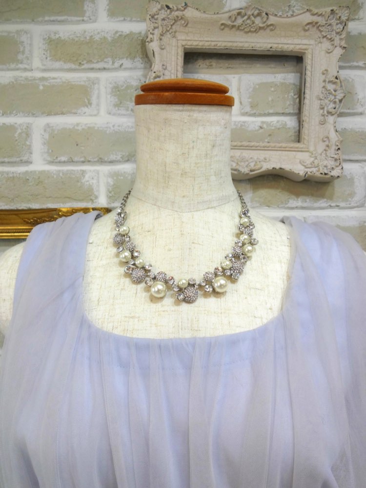 シルバー粒々ストーンとパールをランダムに配置した、バブルデザインのシルバービジューネックレスです。ストーンの種類やパールの大きさなどで奥行きを出したデザインで、サイドにかけて細くなっているので首が詰まって見えないのが嬉しいポイント。丸っこくて女性らしいシルエットは、謝恩会では可愛らしく、結婚式お呼ばれでは優しい雰囲気に仕上がります。また、新婦様のウエディングドレスとも相性◎で、シンプルなドレスに合わせると、ピュアでイノセントなイメージに。また、大粒のストーンはしっかりと輝き、華やかさのポイントもしっかり抑えた万能アイテムです。パールのアクセサリーはレフ板効果もあり、顔色も明るく見せてくれます。輝きが欲しい場合、ただ大きいものを選ぶより、このアイテムのように大きくなくても大粒のストーンが入ったものを選ぶのがおすすめです。