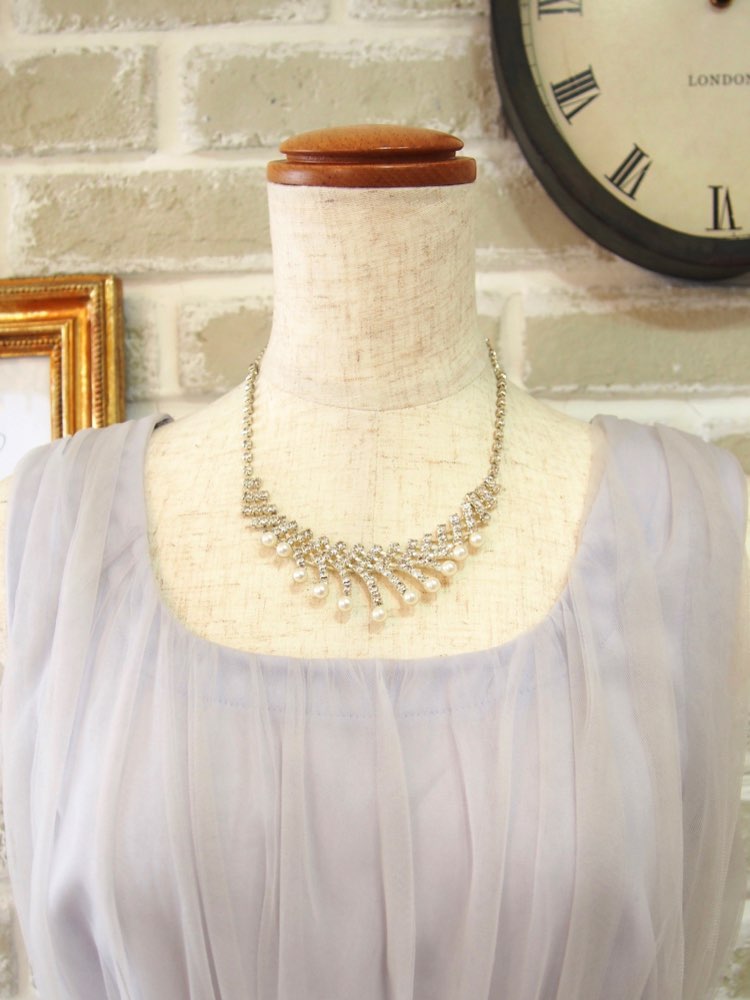 シルバーの流れるようなV字デザインにパールを並べた、かっこいいイメージのショートネックレスです。全体に小さなラインストーンが埋め込まれており、細部まで華やかさにこだわっています。Vネックやベアトップのドレスと相性が良く、煌びやかなパーティーでのドレスアップや新婦様の披露宴でのアクセサリーにもってこいです。角のあるデザインは、クールでシャープなイメージに仕上がるので、かっこいい・大人っぽいコーディネートを目指す方にぴったり。V字に垂れ下がったデザインを活かすには、長さのないイヤーアクセやすっきりまとめたヘアスタイルがおすすめです。