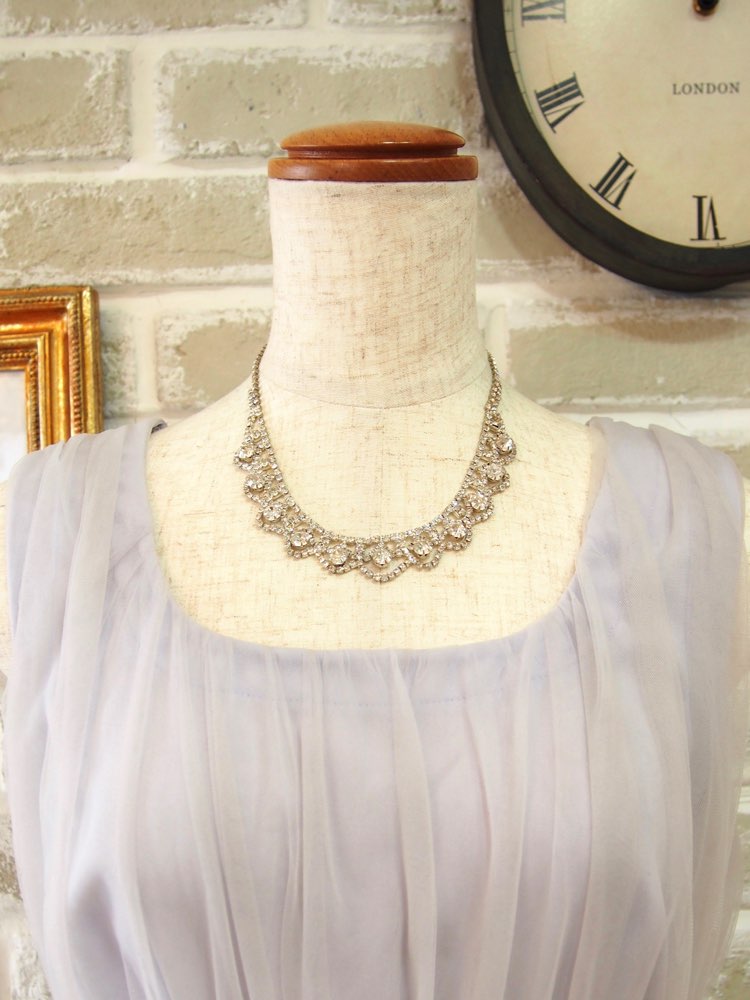 シルバーのラインストーンがレースのようなデザインのネックレス。スッキリとしたシルエットで、フェミニンで可愛らしいな印象です。シルバーカラーなので、どんなドレスにも合うパーティージュエリーの王道です。謝恩会やパーティーはもちろん、新婦様のアクセサリーとしてもおすすめ。幅のないデザインでも、大粒のストーンがしっかりキラキラと輝き、プリンセスシルエットからマーメイドまであらゆるタイプのウエディングドレスやカクテルドレスに合わせることができます。丸みのあるデザインは、女性らしい雰囲気に魅せてくれます。輝きが欲しい場合、ただ大きいものを選ぶより、このアイテムのように大きくなくても大粒のストーンが入ったものを選ぶのがおすすめです。