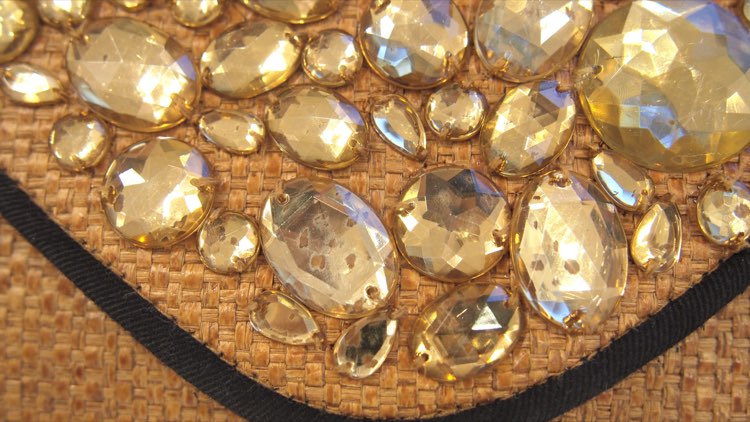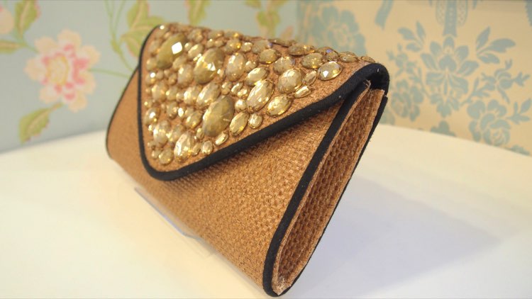 ラタン素材を使用した大人の個性派デザインクラッチバッグ。カジュアルな素材感に、華やかなブラウンカラーの大粒ビジューをランダムに敷き詰めたミスマッチが個性的でおしゃれなアイテム。シンプルなドレスにコーディネートのアクセントとしてお使いいただけます。夏のパーティーや、少しカジュアルでもOKなお呼ばれなどにいかがでしょうか?合わせるドレスもさらっとしたシンプルな生地のものがおすすめです。アクセサリーとのバランスを考えて、こなれ感を狙ったスタイリッシュな大人コーデに。縦幅が大きめなのも嬉しいですね。