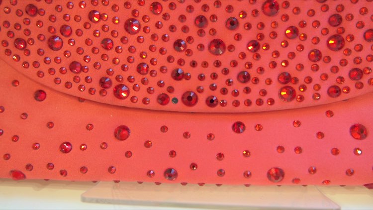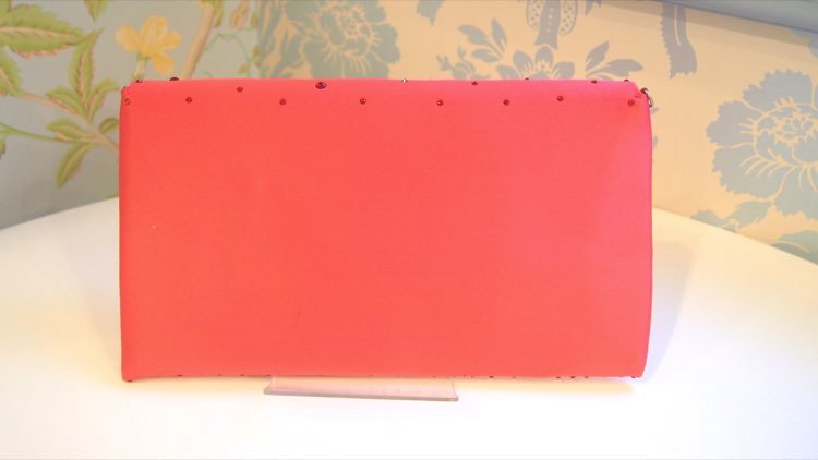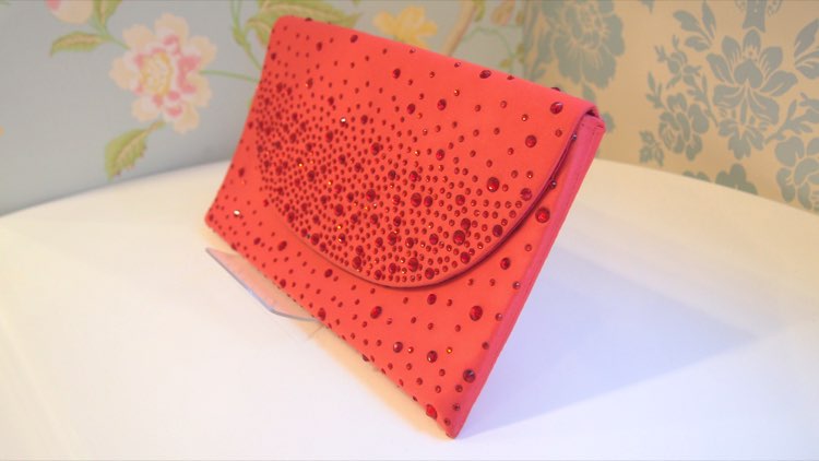 ビビッドピンクのカラーリングがインパクト大の薄型クラッチバッグ。大きさの違う赤色ラインストーンをランダムに、そして贅沢に並べた華やかさ満点のアイテムです。ダークカラーのドレスに差し色として取り入れたり、明るいカラーに合わせて更にカラフルなコーディネートを楽しんでもOKです。カジュアルすぎることもない雰囲気なので、華やかな生地感のドレスにもチグハグにならずに組み合わせていただけます。薄手なので厚みのあるものは入りませんが、ご祝儀も入る幅なので結婚式お呼ばれにもお使いいただけますよ。