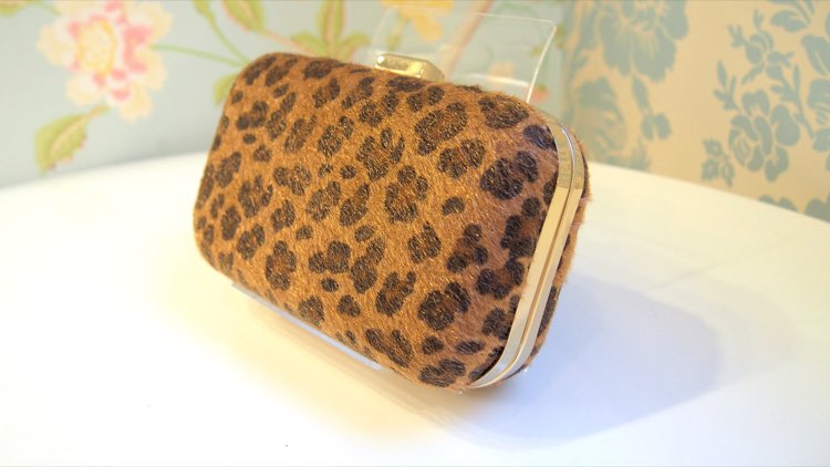 レオパードのフェイクファー生地を一面に使用したハードタイプのミニボックスクラッチバッグ。コーディネートの主役にもなりそうな大胆なデザイン。アクセサリー感覚で、他のアクセサリーとのバランスを考えながら組み合わせていただくのがベターです。パーティーシーンでのご利用がおすすめのイブニングクラッチは、パーティー向けの華やかなドレスにはもちろん、少しカジュアルなテイストのドレスにアクセントとして組み合わせていただくのも◎です。容量が少ない分、見た目のバランスはスッキリ見せることができます。フェイクファー小物の結婚式でのご利用はマナー上お控えくださいね。