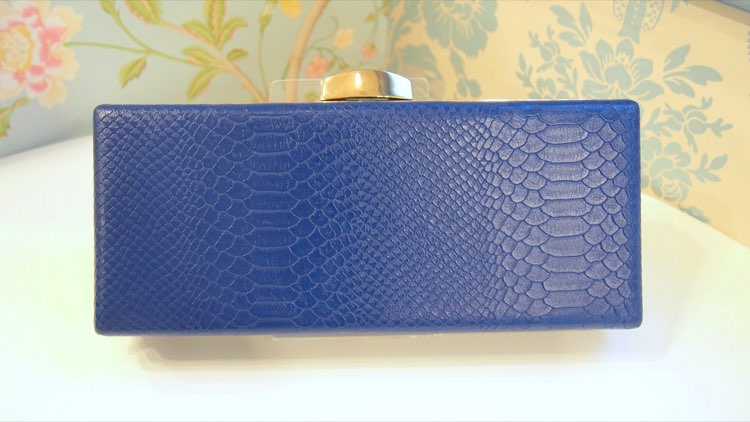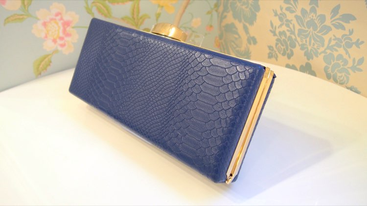 落ち着きのあるディープブルーのクラッチバッグ。ヘビ革のような型押し加工の施されたフェイクレザーにゴールドのフレームがピリッと効いており、洗練された大人のパーティーバッグとして活躍してくれます。シンプルで幅のある大きさなので、パーティーはもちろん、お出かけなどのちょっとしたドレスアップのお供にも。中はファスナー付きの仕切りで分かれていて、収納しやすいのも嬉しいポイントですね!さらっと着れるようなデザインのドレスに合わせて、スタイリッシュで都会的なスタイリングにぴったりです。