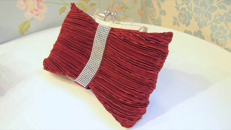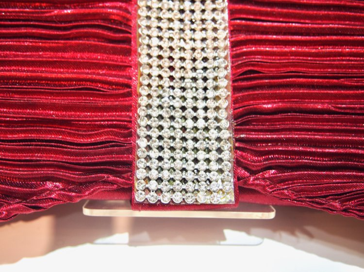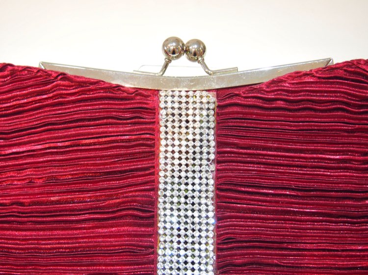 光沢のあるディープレッドの生地の中央にラインストーンをあしらった豪華なパーティーバッグです。パーティーバッグでは定番のリボンデザインで、生地の細かなプリーツが光沢と相まってシックでエレガントな印象です。秋冬に人気のこのカラーは、ネイビーやブラックのダークカラードレスに差し色として合わせたり、淡いカラーのドレスに締めカラーとして季節感をプラスしたりと幅広いタイプのドレスとコーディネート可能。上品で重厚感のあるデザインを盛り込んだバッグは、アクセサリーの要素も兼ねてお使いいただけます。短いチェーンが付いているので、立食パーティーなどでは手提げとして使ってもOK!謝恩会や同窓会で、10代から20代のパーティーバッグ初心者さんにもおすすめです。