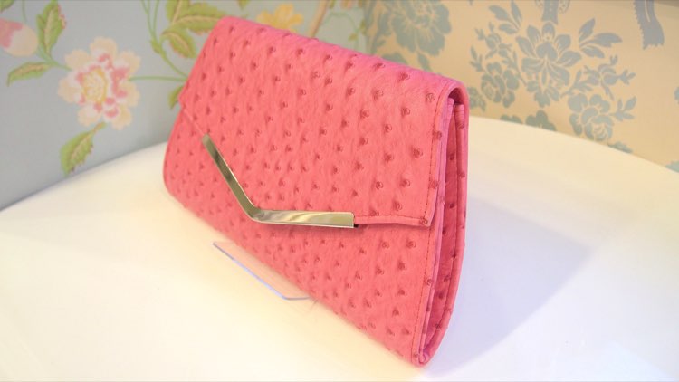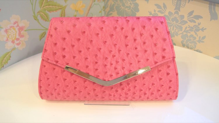ピンクのフェイクオーストリッチ生地の大きなクラッチバッグ。ゴールドのメタルフレームがピリッと効いたレターデザインで、カジュアルさときちんと感がミックスされたイメージ。縦幅があるので、普通のクラッチバッグに比べて手荷物が少し多めに入るのは嬉しいですよね!大きさがあるタイプはカジュアルな雰囲気に見えるので、合わせるドレスの種類もさらっとカジュアルで、コンパクトなシルエットのものがおすすめ。パンツドレスや手持ちのお洋服との組み合わせにも◎です。コーディネートにメリハリを出すアイテムとして、カジュアルなパーティーやちょっとしたドレスアップでのお出かけなどにお使いいただけます。