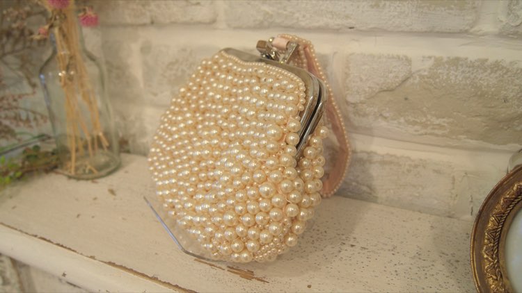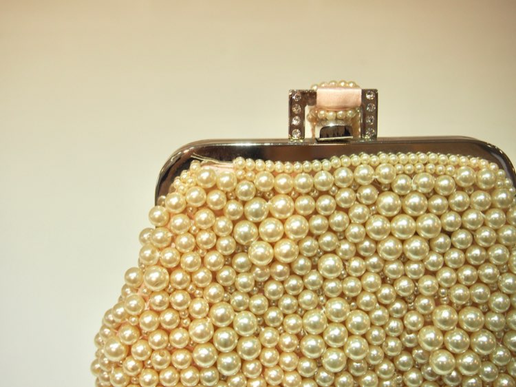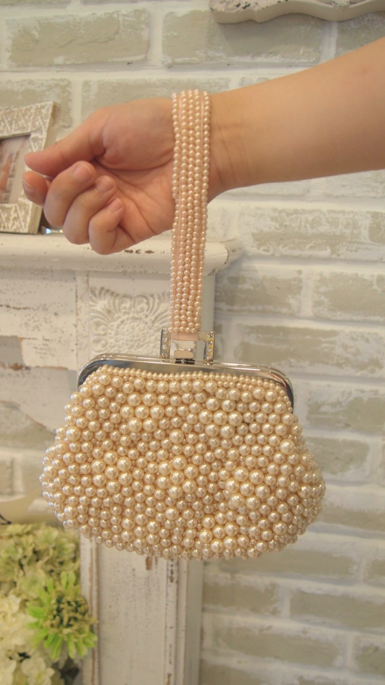 温かみのあるクリームカラーのパールをびっしりあしらったパーティーバッグです。がま口部分にはストーンが埋め込んであったりと、細部にもこだわったデザイン。優しげなパールのアイテムは、落ち着いた雰囲気のドレスに組み合わせたり、明るい色のドレスに組み合わせたり、幅広いタイプのドレスとコーディネート可能。上品で可愛らしいデザインを盛り込んだバッグは、アクセサリーの要素も兼ねてお使いいただけます。持ち手が付いているので、立食パーティーなどでは手提げとして使ってもOK!謝恩会や同窓会で、10代から20代のパーティーバッグ初心者さんにもおすすめです。