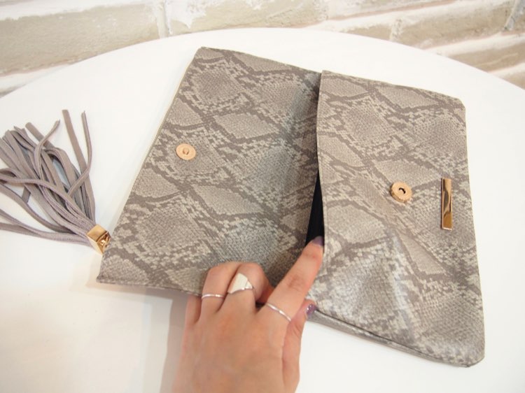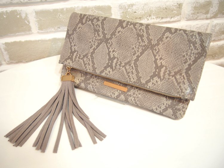 フェイクパイソン生地を素養した薄型クラッチバッグ。落ち着きのあるカラーにタッセルや飾りのファスナーなど小技が効いており、大人カジュアルなイメージ。昔ながらのパーティーバッグよりも洗練された都会的なデザインはカジュアルな雰囲気に見えるので、合わせるドレスの種類もさらっとカジュアルで、コンパクトなシルエットのものがおすすめ。パンツドレスや手持ちのお洋服との組み合わせにも◎です。コーディネートにメリハリを出すアイテムとして、カジュアルなパーティーやちょっとしたドレスアップでのお出かけなどにお使いいただけます。※一般的なクラッチバッグ同様、フタで開閉するタイプ。表のファスナーは飾りです。開きません。