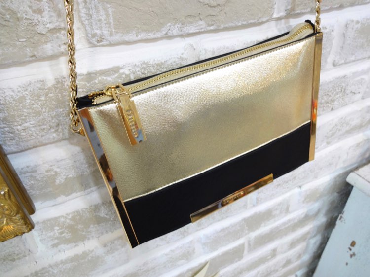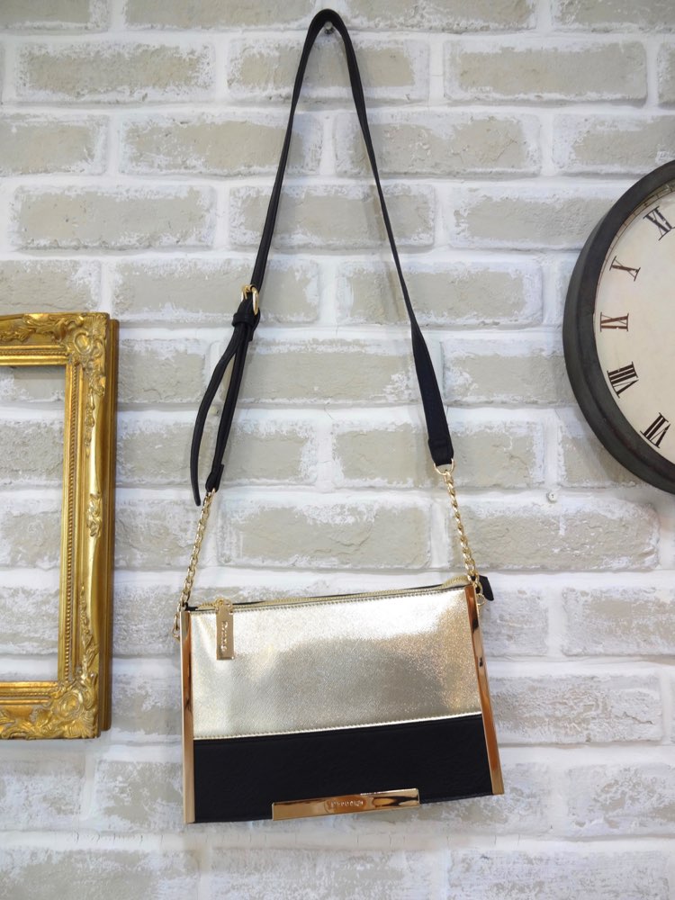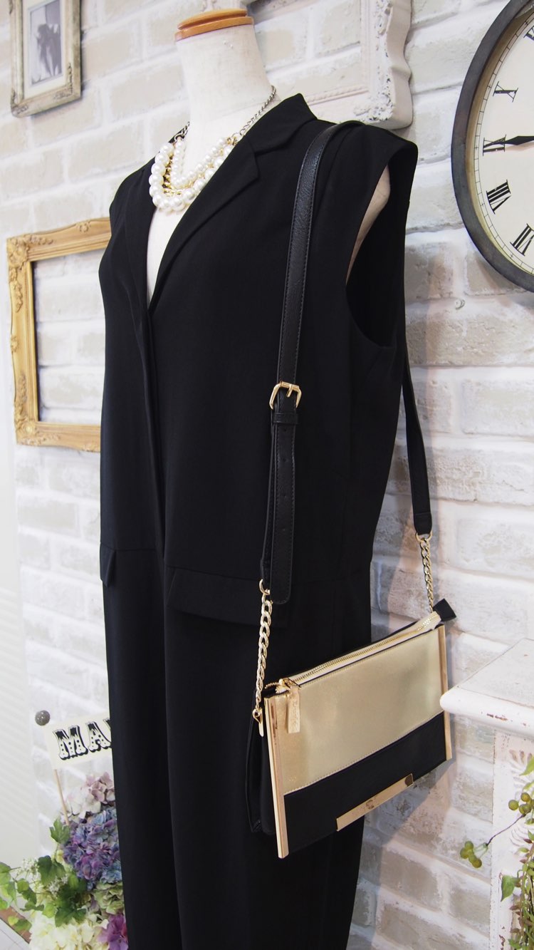 ブラックとゴールドのカラーリングがシックで大人っぽい、ツートーンカラーのショルダーバッグ。中は仕切りでいくつかに分かれており、機能性も抜群です。ごくカジュアルな、ちょっとしたパーティーやお出かけなどでお使いいただけます。クラッチバッグと比べてもデイリー使いの要素が大きいので、普段着との組み合わせもOKです★部分的に使われたゴールドメタルがラグジュアリーで華やかさを添えてくれるので、お手持ちのバッグじゃチグハグだけど、クラッチバッグじゃやりすぎかな・・というドレスアップシーンに活躍します。