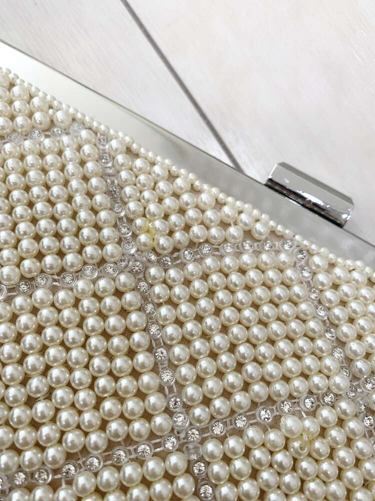 優しく女性らしいクリームカラーのパールをびっしりとあしらった、エレガントなベージュのパーティーバッグです。前面に敷き詰められたパールに、格子状に綺麗に整列したラインストーンが煌びやかな雰囲気をプラスし、アクセサリーのような華やかさを与えてくれます。シンプルなドレスもゴージャスバッグを組み合わせると、程よいドレスアップ感のある綺麗なイメージに。結婚式や二次会などのフォーマルなシーンから、各種パーティなど華やかな場面にもぴったりなあらゆるシーンやドレスに合わせやすいアイテムです。