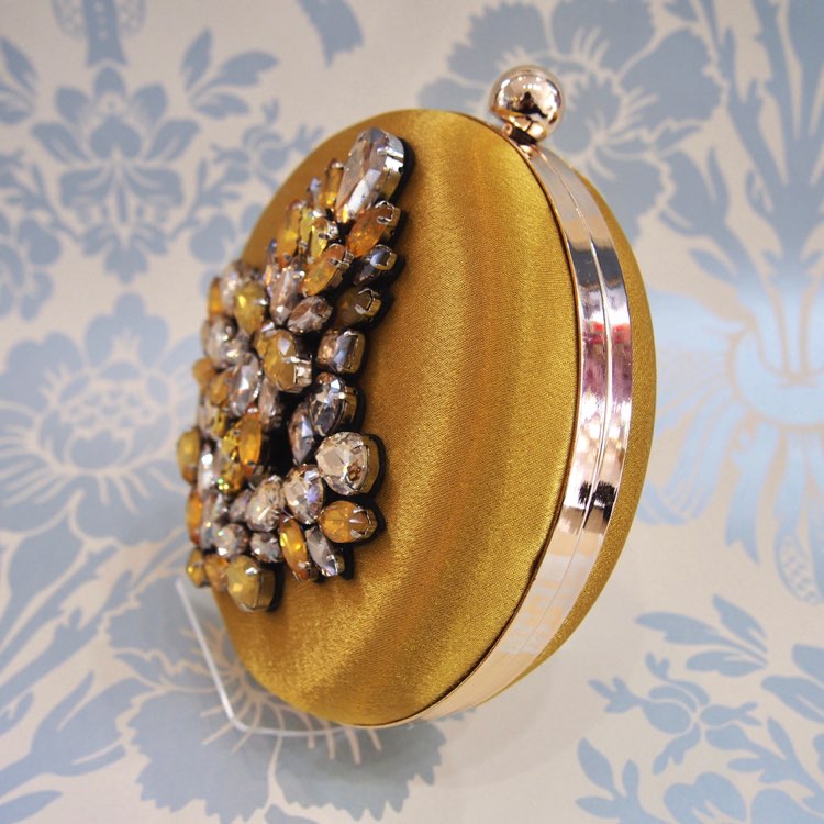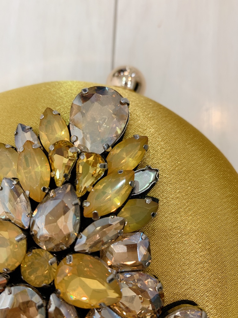 マスタードカラーに丸いフォルムが印象的なハードタイプのミニボックスクラッチバッグ。コーディネートのスパイスとして活躍してくれそうなアイテム。デコラティブな前面のビジューはインパクト大で、アクセサリー感覚で組み合わせていただけるので、ドレスとの色合わせを考えるのが楽しくなりますね。パーティーシーンでのご利用がおすすめのイブニングクラッチは、パーティー向けの華やかなドレスにはもちろん、少しカジュアルなテイストのドレスにアクセントとして組み合わせていただくのも◎です。容量が少ない分、見た目のバランスはスッキリ見せることができますよ。スタイリッシュで洗練されたイメージに。ご利用の際はビジューがドレスに引っかからないようにご注意くださいね。