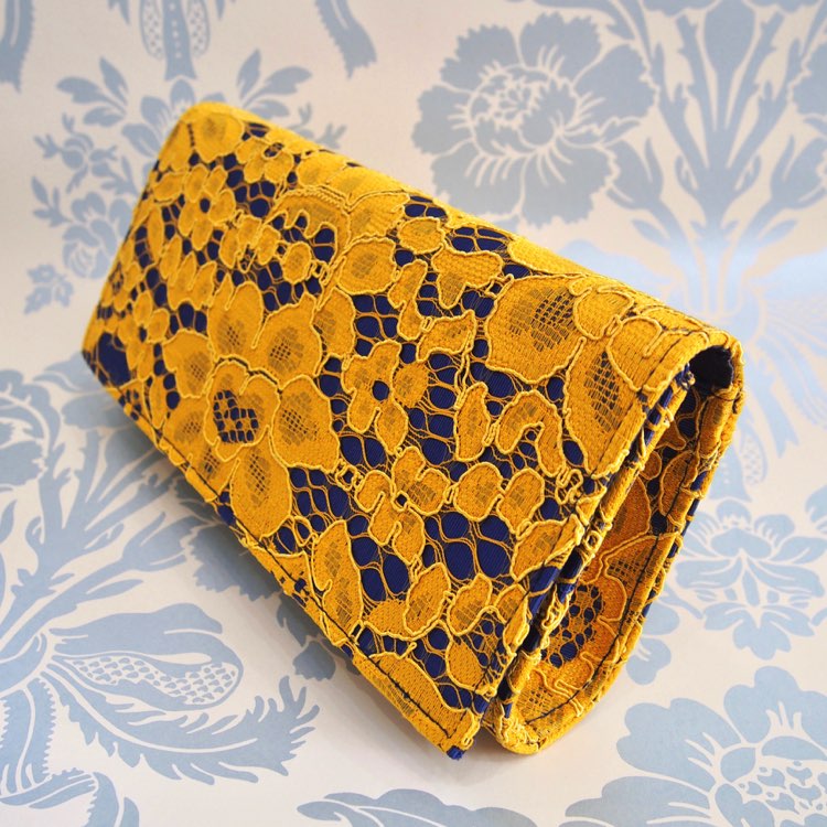 イエローのフローラルレースをブルーのグログラン生地に重ねたクラッチバッグ。インパクトのあるカラーリングがコーディネートの引き締めに一役かってくれるアイテムです。一般的なクラッチバッグより少し大きめの嬉しいワイドタイプ。シンプルで柄のないドレス、ネイビーやブルー・グリーン系のドレスに差し色として投入するコーディネートがおすすめ。大きなアクセサリーをつけなくても、華やかでメリハリのあるコーディネートに仕上がります。結婚式からちょっとしたパーティーまで、幅広い用途でお使いいただけます。