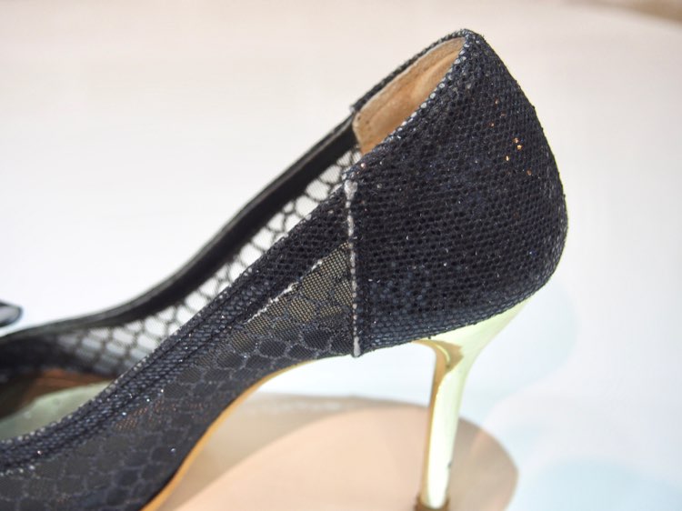 ブラックのリボンデザインオープントゥパンプス。ふんわり柔らかなリボンに、ボディにはさりげなく仕込まれたグリッターの生地がきらめくパーティーヒールです。重たくなりがちなブラックカラーのシューズも、透け感のあるシアーな生地やゴールドカラーのピンヒールのおかげですっきりと軽やかに見せてくれるので、秋冬だけでなく春夏にもコーディネートに取り入れやすいアイテムです。謝恩会や女子会などの華やかなパーティードレスにぴったりな、可憐で華やかな足元を演出してくれます。