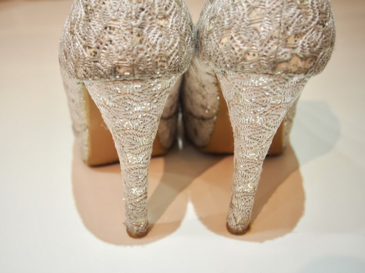 スタイリッシュな印象で使いやすいシルバーホワイトカラーのオープントゥパンプス。レース生地の間にびっしりと埋め込まれたホログラムがキラキラと煌めき、新婦様の披露宴から2次会までのウエディングドレスの純白感を損なうことなく相性抜群です。11cmと高めのヒールではありますが、十分に厚みのあるストームのおかげで見た目より履きやすく、脚長効果も抜群。つま先は、足元にすっきり感を与えるオープントゥタイプ。ロングドレスにも最適です。シンプルなデザインであらゆるタイプのドレスに合わせやすく、重厚感を感じる厚手の生地と程よいボリュームは足元だけでなくコーディネート全体にメリハリを与え引き締めて見せてくれます。