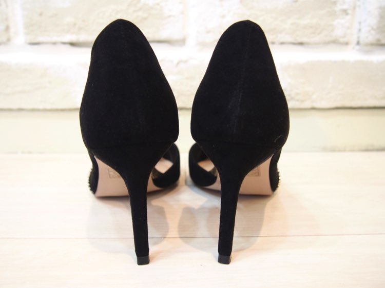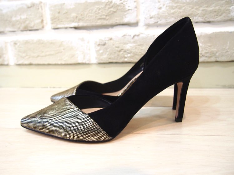 エレガントな気品漂うブラックのフェイクスエードパンプス。つま先は大人でかっこいいポインテッドトゥ、ゴールドのメタリック生地が効いたコンサバティブで上品な雰囲気は、あらゆるコーディネートに取り入れ易いアイテムです。8cmと程よい高さのピンヒールでグラマラスさを忘れないのが海外らしいデザインです。フェイクスエードの生地は普段使いにも取り入れやすく、お手持ちのお洋服や普段着ないようなドレスまで、オンオフあらゆるシーンに合わせてお使いいただけます。パーティーでは、大人っぽくスレンダーなシルエットのドレスと合わせていただくのがおすすめ。かっこいい女性像が思い浮かぶような、スタイリッシュでエレガントなイメージのコーディネートに。